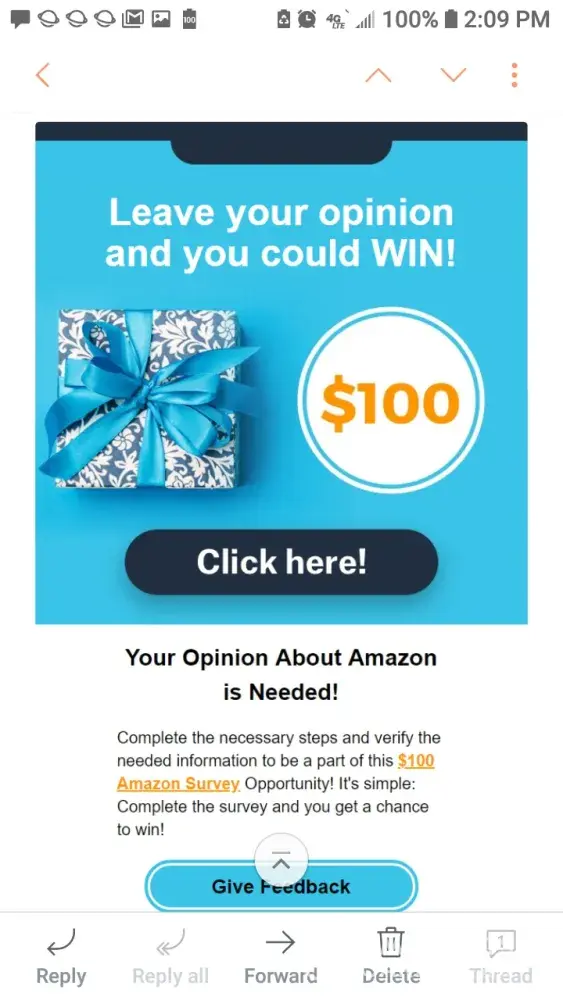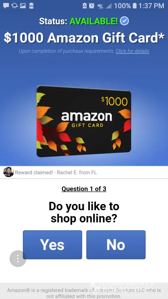 I got an email saying if I completed a survey I would get $1, 000 Amazon or $1, 000 Walmart gift card of my choice I completed the survey and nothing happened it's a bunch of BS. It's a terrible way to do business and someone needs to do something about it cuz they need to stand behind their word. I would really like to receive my gift card or why even have a survey? Please send my gift card to
