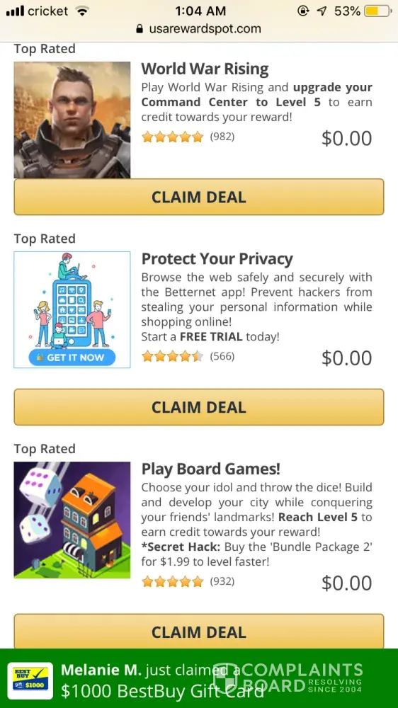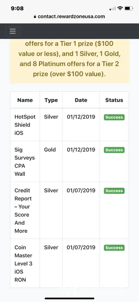 Before getting links I sent email to rewardzoneusa.com complaining that I finished the two offers and nothing came up on screen, and then I got the two texts with links that didn't work.