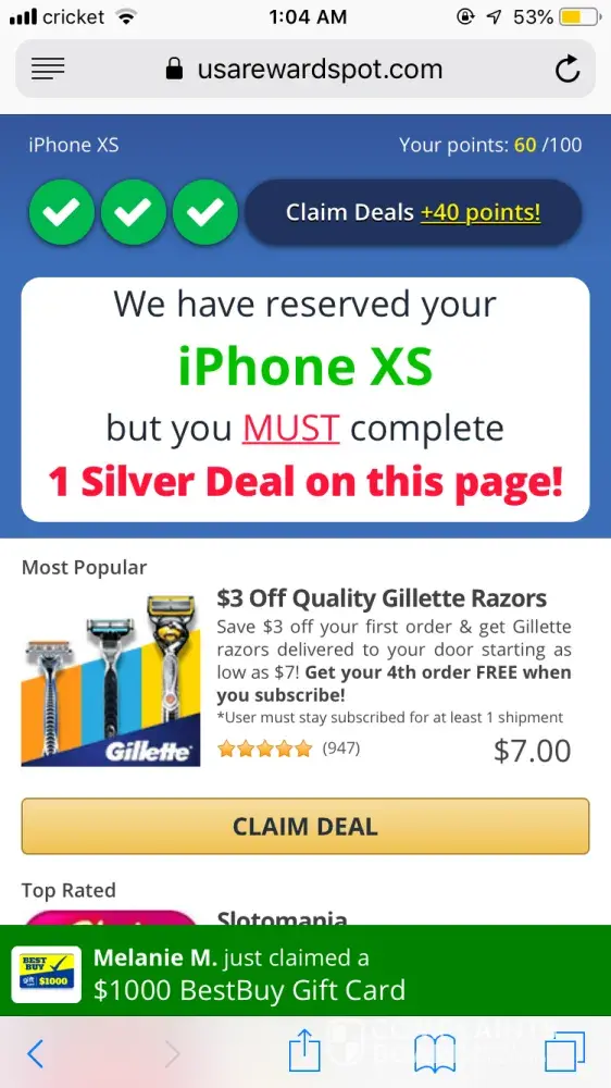 On usarewardspot.com, I was asked to provide some of my information, complete a survey and an offer to recieve an iPhone XS. I completed the survey and offer multiple times and was still brought back to do it all over again. I spent an hour on this website and I have proof of completing the offer. This is honestly not fair and I would like my iPhone XS. Please get back to me, Thank You from an unsatisfied person.