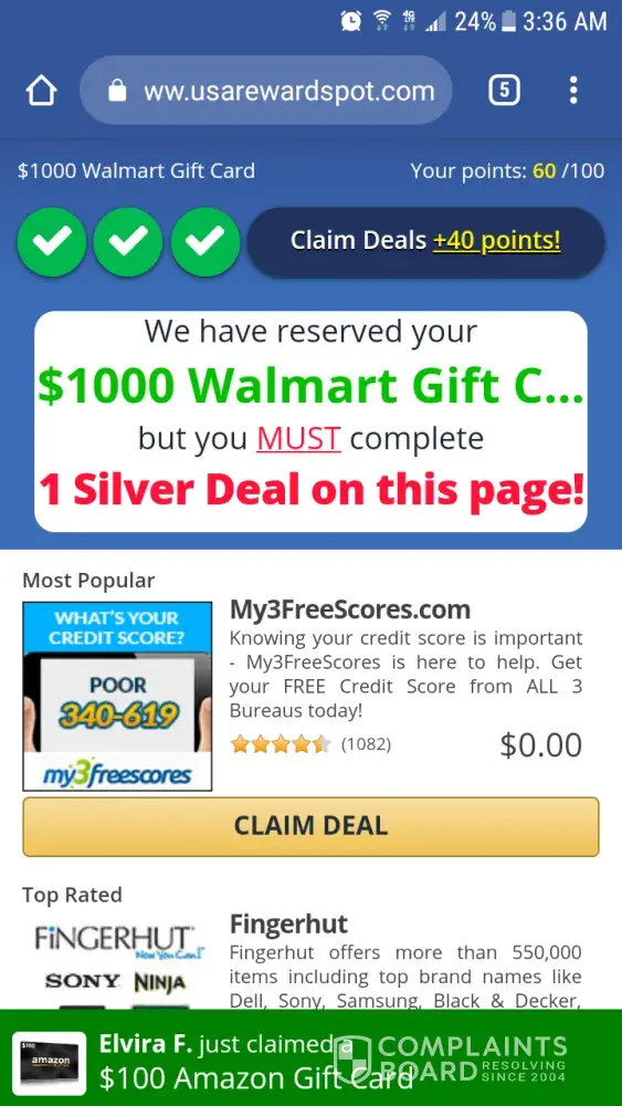 I completed the survey and my email and everything and I have 60 points of of 100 to get 40 more points you have to claim a deal so I chose World war Rising it says to Play world war rising and Upgrade your command center to level 5 to earn credit towards your reward and it's worth 40 credit points which will give you 100/100 point which will give you your reward which is the $1000 Walmart gift card well I pass level 5 and got to level 6 on the world war rising game and when I go back to claim it it doesn't do anything but go back to the game
