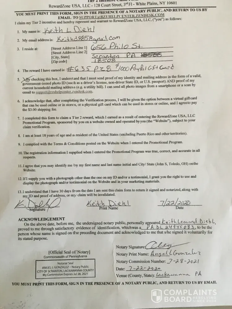 I completed 9 offers when only 8 were required in promise of a $1000 visa gift card. I signed up for PAID subscriptions, purchased Amora Coffee, joined the Disney Movie club, bought Eaglemoss books, and subscribed to some other book clubs and offers. I saved all the screenshots and receipts. I have NOT received my reward for completing the offers. I tried to contact the company, sent emails, called numbers that I found online but couldn't reach a real person. I filed the claim form on the reward zone website where it showed I completed 9 offers and the requirements to receive my reward. I kept trying to get my reward but ended up giving up because it was too much stress and I wasn't getting anywhere, no one would respond to me. This was in September 2017 when I completed the survey. I am just now trying again to see if i will be rewarded what was promised. I seen a post on Facebook with people receiving $100 McDonald's gift cards from this company and so now I am back again trying to get my $1000 Visa Gift card because if you are a real company and people have received your $100 McDonald gift cards then I should also receive the $1000 Visa Gift card I completed the survey for. This survey ended up costing me about $150-$200 with all of the subscriptions and shipping fees. This is not fair and I feel this company is a scam but somehow still in business! I would really appreciate if a representative would reach out to me. I have NOT heard anything, sent countless emails, completed the claim forms, I just want what I was promised! You guys almost got me again with the $100 McDonald's gift card but I did not complete the survey because I know I will never see any gift card. You can contact me, I can provide my contact information for you at your request. Please be understanding of your customers. A response from your company would be greatly appreciated.