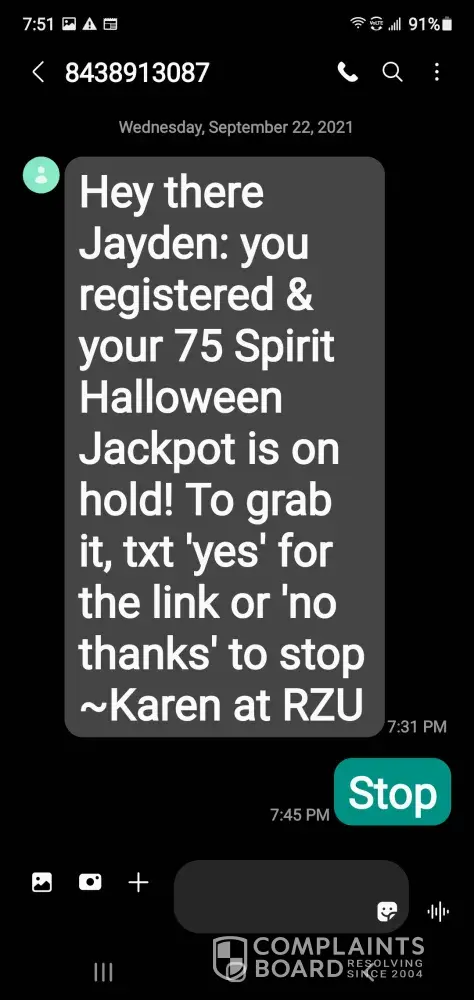 I have politely asked for phone calls to stop. You are interrupting my day into the evening as late as 745 and today I get a text from a local south Carolina number from a lady named Karen leave me alone or you will have a harassment lawsuit next!