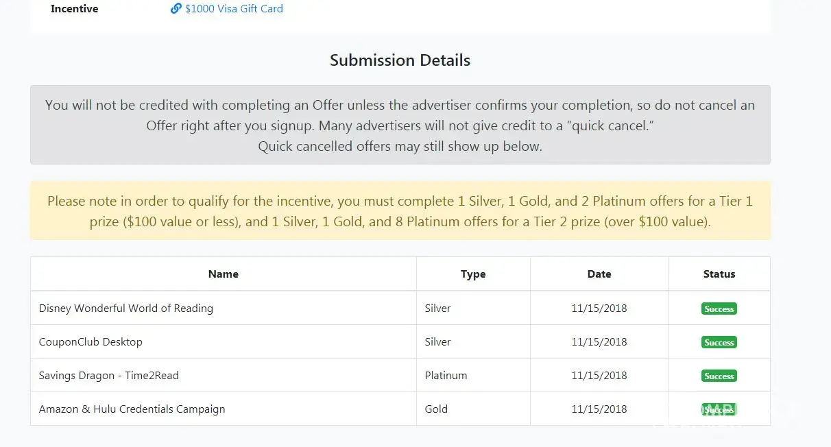 On Oct. 20 I completed the requirements to receive a $1000 gift card. The site warns the participant NOT to cancel "right away" because the reward would be lost.