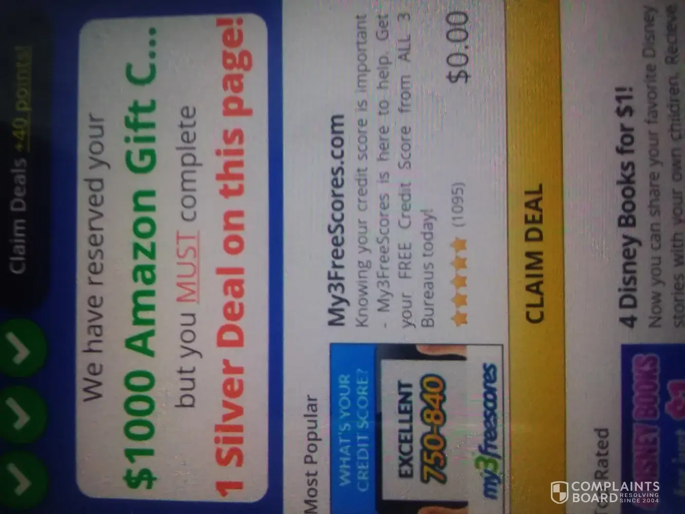 This site has made it impossible to complete the requirements to obtain the $1000 Amazon Gift Card i was promised for participating in a survey. I later discovered I must select 'deals' to make purchases or join monthly services. I select various offers, and paid to create accounts to join, etc. and then hit the NEXT button, however it tells me I have not selected anything. I'm now enrolled in at least 2 credit report services, and I've downloaded two or three applications. This is ridiculous. Please assist.
