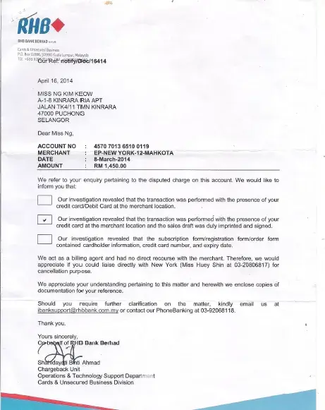 I am truly disappointed that Ms. Shahidayati Binti Ahmad, RHB Bank Berhad, Chargeback Unit,
