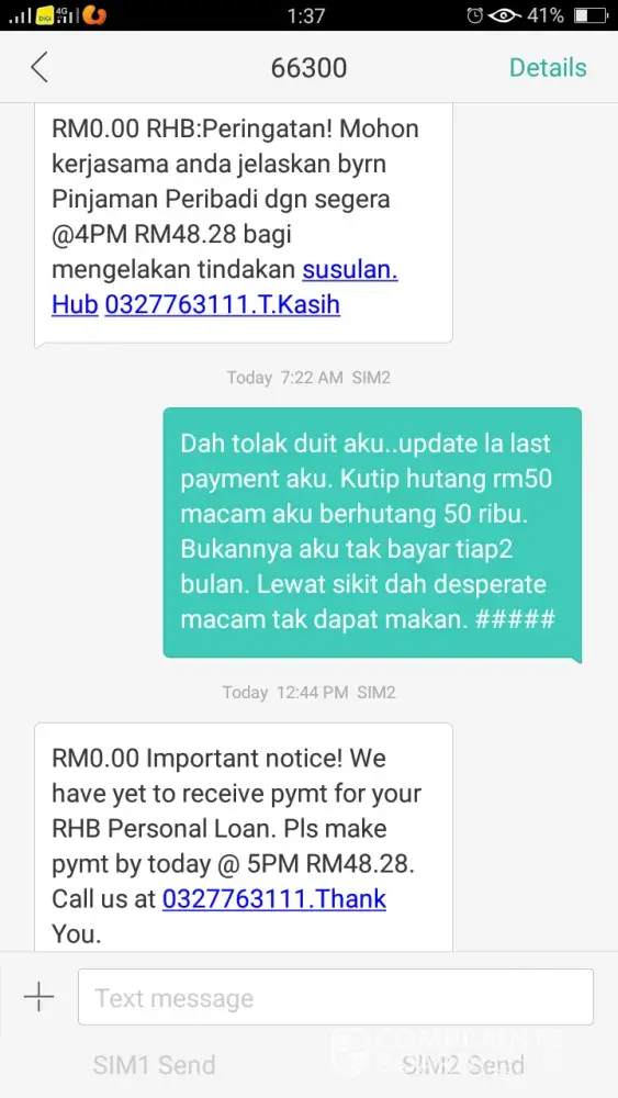 The number that used for the sms is 66300. I've tried to ignore this kind of unknown message but still sending me a message with that statement every month. If there has any person who used up your bank's name to threaten peoples, it is more better to your bank (RHB Bank) to take strictly action towards this issue.