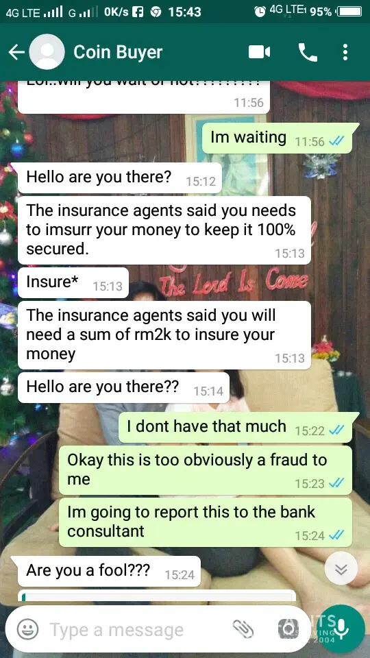 A coin buyer asked me to verifed my accout for RM550 so that i can receive RM5000 but at last asked me to Credit another RM2000 for insurance. This guy appears to have agent in the Maybank stating all of this requirement without stating a bank issues a receipt or requirement of how much ahould be deposit and frankly making fake instagram account to scamm coin or old money seller in Malaysia Singapore and Brunei.
