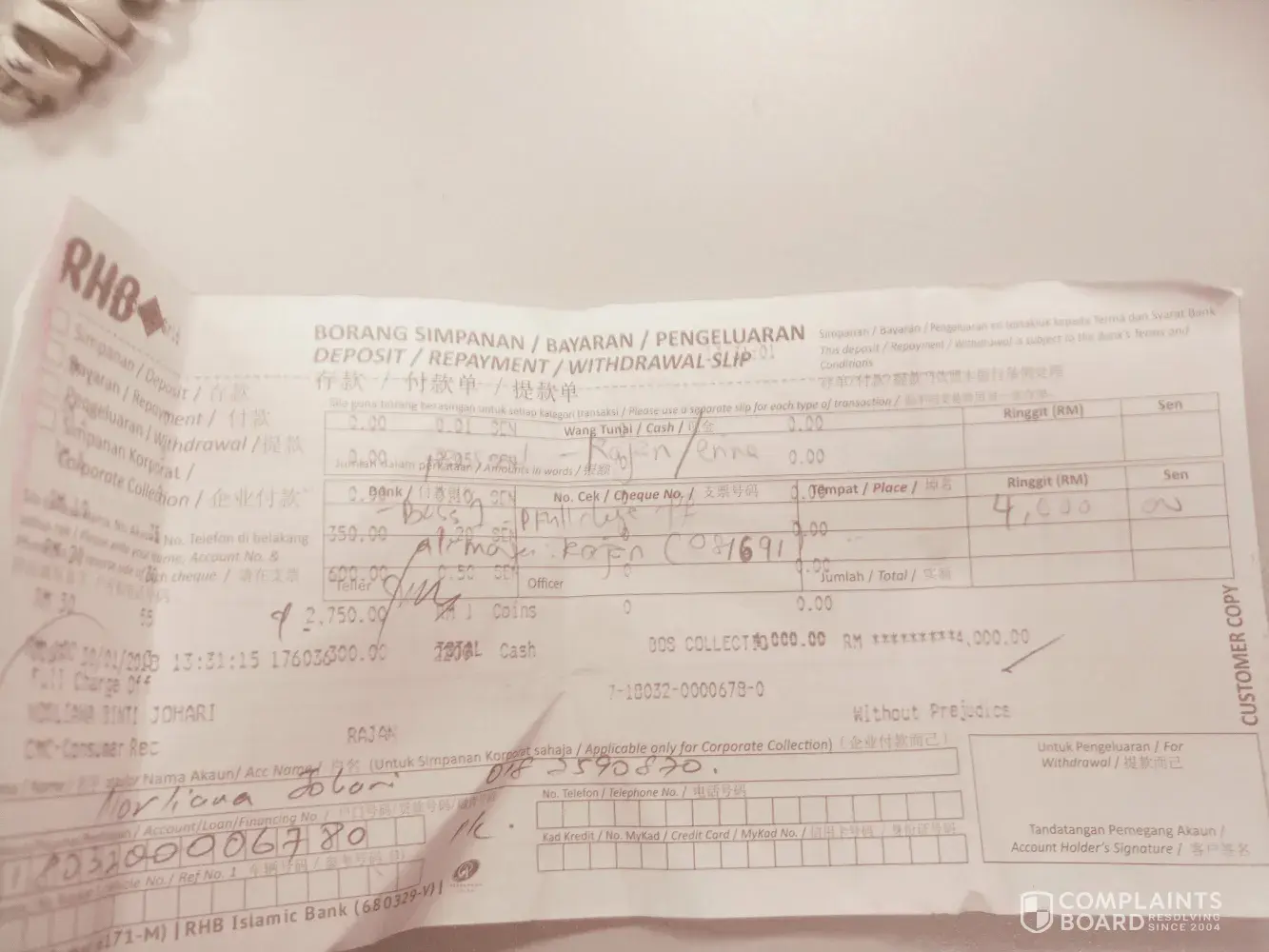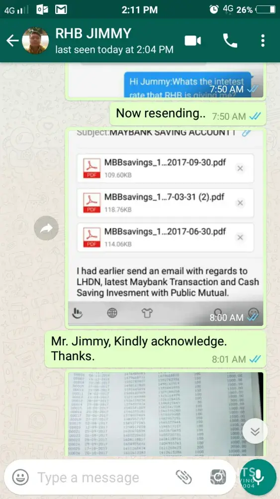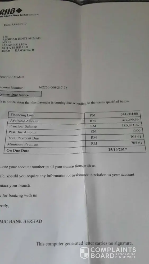 Pada pertengahan tahun 2017, saya telah menerima panggilan lagi dari wakil rhb bank dan menyatakan perlu untuk membuat pembayaran bagi menggelakkan tindakan undang-undang terhadap saya dibuat. Saya menjadi hairan, setahu saya pada masa kehadiran wakil bank ke restoran kami, pemahaman saya pembukaan akaun tersebut adalah akaun simpanan kenapa saya perlu buat pembayaran dan tertunggak pula tu?