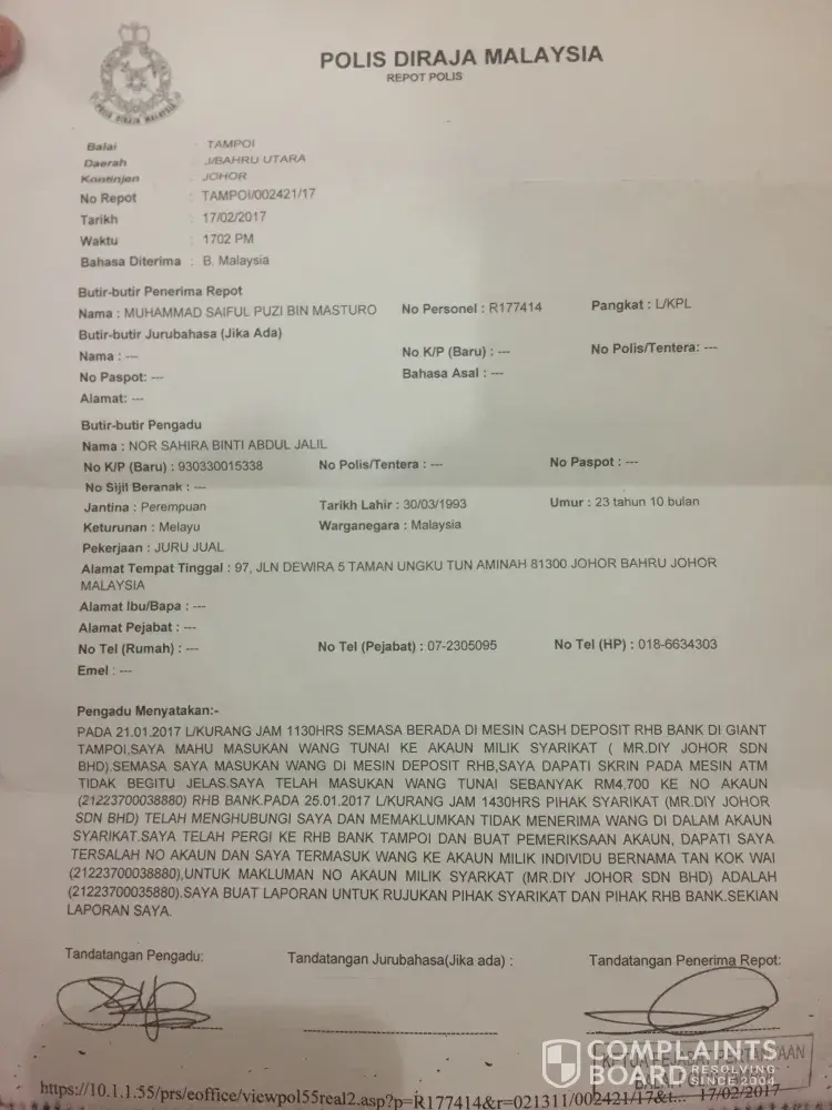 Pada 21/1/2017 pukul 11.30 pagi saya telah memasukkan sejumlah duit rm 4700 di mesin deposit di giant tampoi ... no akaun sepatutnya [protected] tetapi saya masuk ke akaun [protected] (tan kok wai ) sepatutnya saya masuk kan ke dalam akaun company saya, akan tetapi saya telah salah masuk akaun org lain di sebabkan machine ketika itu blur ... kemudian saya telah call customer service rhb namun mereka kata tidak boleh dapat balik ... kemudian saya telah buat report polis dan telah pergi ke rhb bank di mana owner akaun tersebut buka akaun di taman bahgia kl namun mereka bg alasan sama ... saya ada bukti saya salah masuk akaun hanya pulang balik amount y saya salah bank in sebab saya ada bukti ... boleh tak pihak rhb buat sesuatu dgn kes ini? Sebab kes bulan 1 skrg sudah hujung tahun namun phk rhb tetap tidak beri sebarang maklum balas ...
