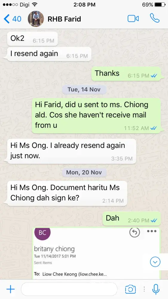 Secondly, I had received a call from Farid again and saying we miss out a from and sign to pass him the form. We had received the mail which Farid and his superior Liow Chee Keong as sender the form to me. I m asked to return the mail with the signature on it as acceptance of the offer letter. After sign the letter and I replied to Farid and cc. to his superior Liow Chee Keong as well. I had been sending the mail twice as I keeping it right now.