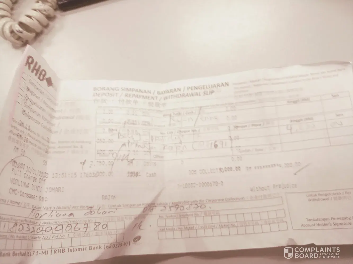 Saya adalah mohd rasidi bin teneh dan no. Kad pengenalan [protected] membuat aduan disebabkan terkejut dengan panggilan telefon dari wakil rhb bank kuala lumpur yang menyatakan mengenai tunggakan bayaran pinjaman dan akan dikenakan tindakan undang-undang..