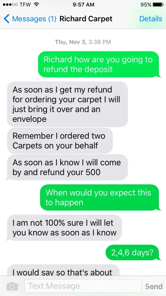 Richard ripped me off $500 cash deposit. Never did job. Promised to return money. Never did. See supporting text screenshots from his phone. Got ripped off by Richard Rokowski from facebook [protected] took $500 cash deposit and never did job. Always had an excuse. Kept wanting me to put money directly into his Well Fargo account under Richard Rokowsi LLC. I asked for a refund for weeks and he replied by text see below that he would return the money. He Never did. I gave him plenty of time as you can see from screen shot of his text replies. Wife found numerous people on fb with same scenario.