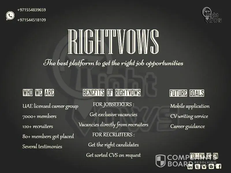 The rightvows is the fake GCC Career & Job Portal Never ever trust with them... they charge illegal money and they are full of scammers peoples in uae specially dubai Those are the group of scammer people contact details if you found any of the member or any one contact just report them here are the numbers: +[protected]​â ​ +[protected] +971...