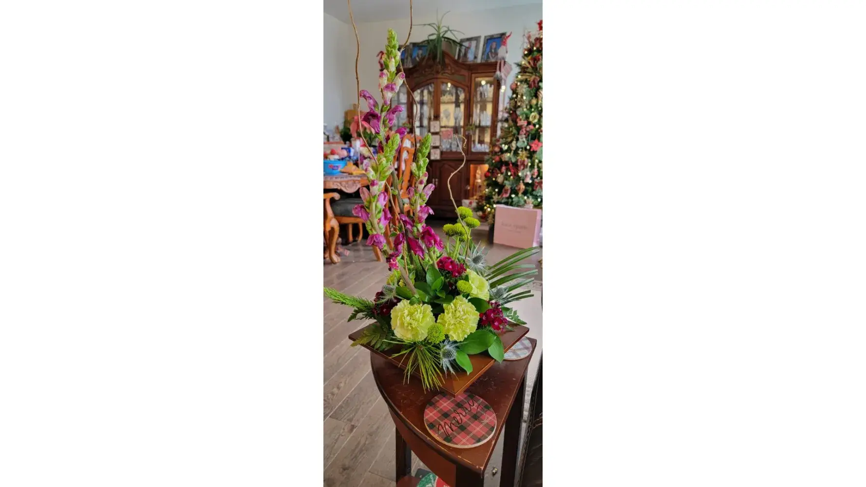 After Googling flower shops in Carlton Place Canada from the UK Ritas Flowers came up bizzarly as I’ve since found out their based in the USA I chose a display for my niece who’d just had cancer surgery aged 45 with a prominently orchids and tropical leaf display that would last a long time and that she wouldn’t have to mess about with being incapacitated it arrived late at night she sent me photos so I could see it.. no orchids just cheap fox gloves that at best last a few days before dropping off the container should have been lime green was infact horrible brown I had paid extra for a bigger display so it went from one green carnation to three! there were twigs instead of tropical items … because I’d googled