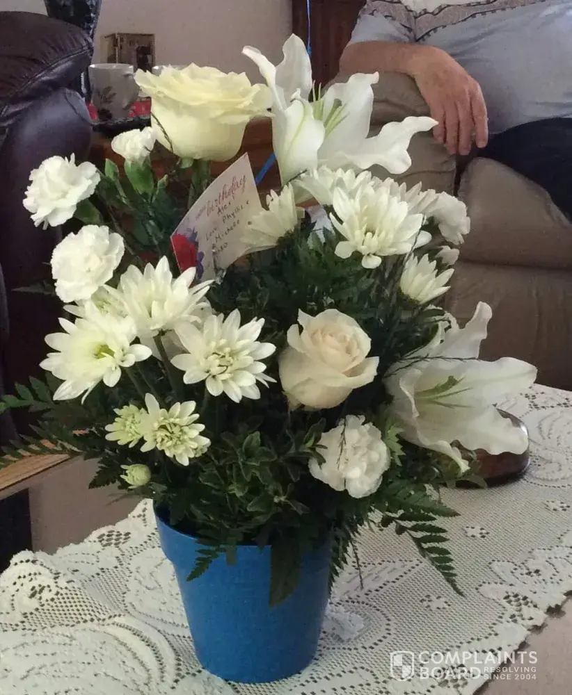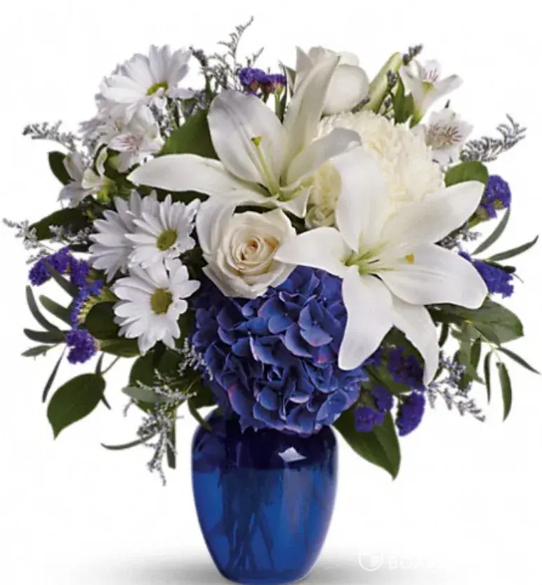 Ordered Beautiful in BLUE...what arrived were all white flowers...not one blue one. The glass blue vase advertised ended up being a wide blue plastic sand pail. They never ever answer their phone. Prices shown in CAD and they bill you in USD. 😠Atleast they were in decent shape. Horrible company. Pic with blue flowers was the pic from their website.