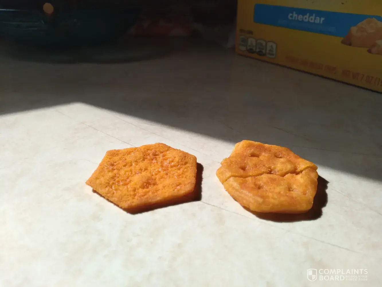 I purchase 1-2 boxes of Ritz cheese crispers per week. I enjoy them so much I recommend them to family and friends often. Oct. 7, 2021 I bit into the crisp in pic on right side and broke a tooth. As in pic, this crisp is thicker and ridiculously hard. My bite did not break the crisp, I used a hammer. I thought it might not even be food, maybe some form of hard plastic but it finally broke. What is going onNo dental insurance. Now what? I am a bar manager and greet customers all night 5 nights a week. I am beyond upset and embarrassed and would greatly appreciate a response. You can email me at [protected]@gmail.com if you need more information regarding a resolution before I seek legal counsel.