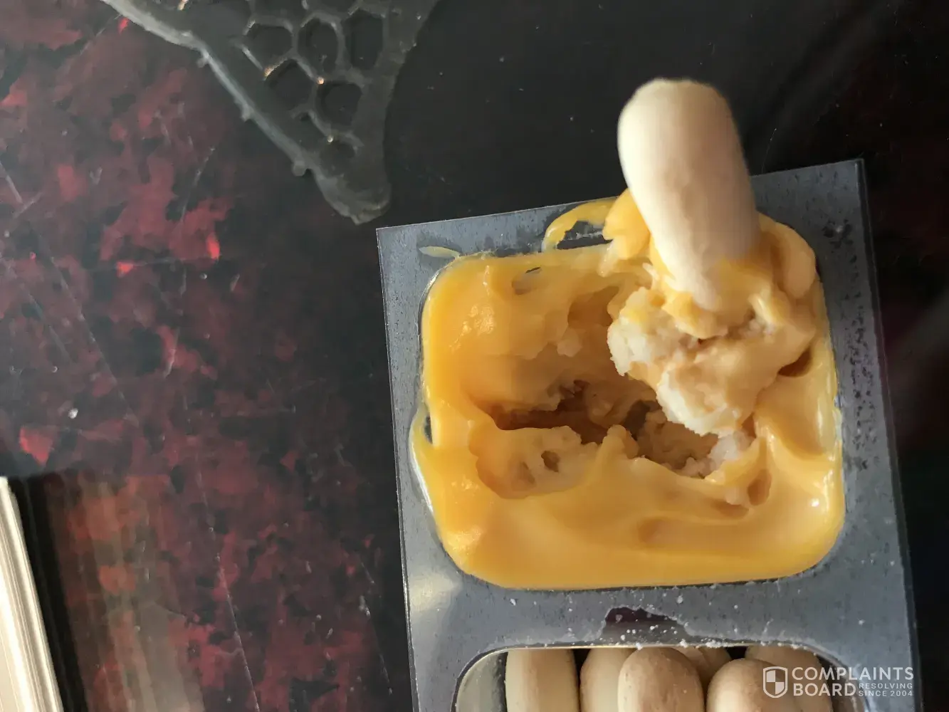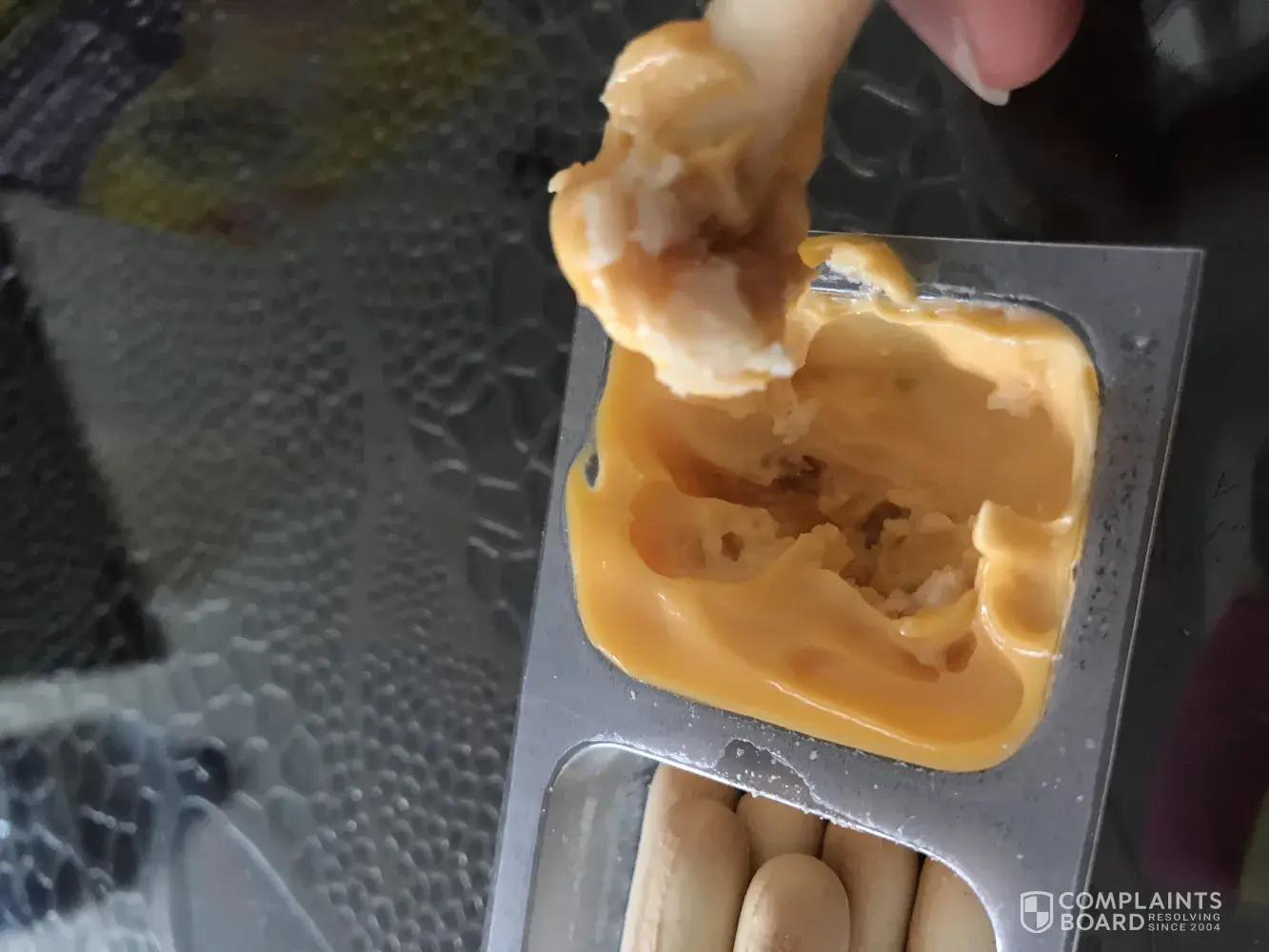 I got this product at the Costco in Victoria on the 22nd or August 2018 as a little snack. But on August 24th 2018 when I opened one of the packets I saw that instead of eight breadsticks, there were seven and a half. Now this happens quite frequently and I wasn't too upset, but when I dipped one into the cheese dip, I found the other half of the missing breadsticks. The dip was smooth and it looked like completely normal but when I dipped the breadsticks in it, it looked like someone had chewed up and spit back a lot of the breadstick, which was rather appalling to say the least. Unfortunately i did consume a bit of the chewed breadsticks and I feel it is completely unsanitary. I am extremely upset by this and I am not sure if I would like to buy this product again. I'd like a full refund of the product please.