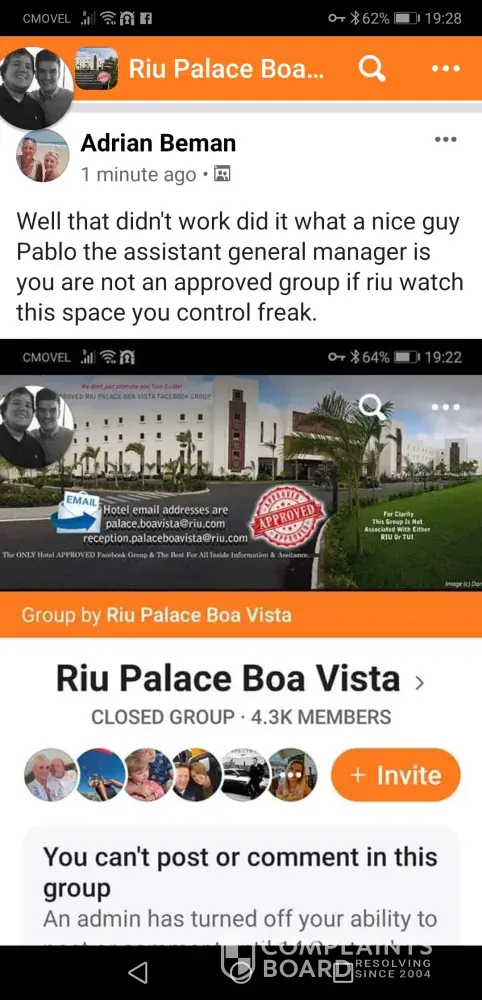 We are currently staying in Cape Verde at the riu Palace I have spoken today to the assistant manager Pablo regarding a Facebook page set up saying its a approved site they will let nobody put any comments regarding any customer issues the site is basicly saying your hotel is perfect so when customers have issues they are not allowed to voice an opinion in my opinion and many other people we have spoken to they may not come back as it looks like your company are allowing them to run the site for you. Some of the people who we have spoken to would not have come knowing this. The manager said he was not aware of the Facebook page and said it is not approved and would report this. The site needs to be closed as its costing you customers re booking or not wanting to visit.