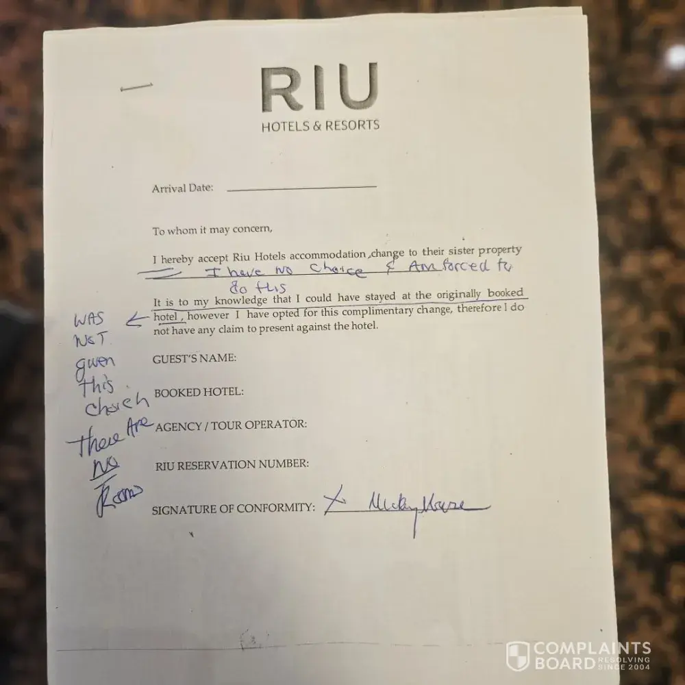 We were a party of 4 and had reservations at the RIU Palace Las Americas. FROM 2/10/24 - 217/24. Upon arrival we were told they had overbooked and would send us to a sister hotel of theirs 2 miles up the road. We had booked this hotel because we spent our honeymoon there 18 years previously and we were celebrating. Then the front reception staff would not move us to the other hotel until we signed their form saying we were going WILLINGLY WITHOUT COMPLAINT. I will attach the form, it was such a joke that I signed it Mickey Mouse! All the hotel is trying to do is cover their butts with a form like this and they would NOT even allow us to go to the other hotel until we signed the form UNDER DURESS. Since they knew we were there celebrating an anniversary they told us they would move us back after 2 nights in the other hotel, which they did do. In my opinion when I booked the palace and paid the price for the palace which is over $300 more per person then we should have been compensated in cash for the difference. Instead they gave us each a 50 minute massage thinking this was sufficient, it was NOT. Another group of 10 people were being forced to do the same thing and were told if they could get enough people to move, they would give them rooms. Unreal how this hotel operates. My name is Kelly Cota when you research your records.