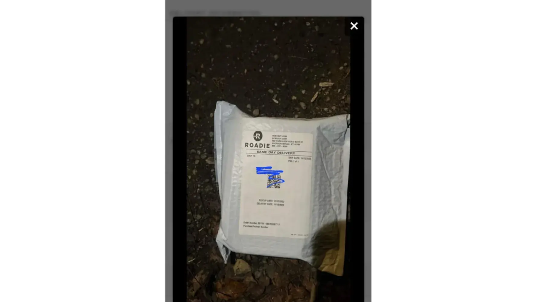 Waited hours for two packages from Best Buy that was picked up at 3 pm November 13, 2022. Received several texts saying it was on the way. Finally gave up and went to bed at 10pm. I saw lights approaching my house at 10:05 and looked out the window. The vehicle was a gray car as expected from information in a text describing the delivery vehicle. It slowly passed my house and went up the road and turned around. It then drove back past my house without stopping. At 10:07 I received a text saying my packages had been delivered. I immediately replied back to the text saying they had not and got no reply from them. I texted again a few minutes later and no reply again. I then looked at the tracking and the driver had uploaded pictures of my packages laying on the ground in dirt and gravel but with nothing in the background to identify where at, just a closeup of the package. There was also a picture of their gps map showing that they had been near my house. I then called the number from the text and waited on hold for 50 minutes after being told I had a 5 minute wait. Then a recording let me know that there were no available agents. It said I could leave my number for a callback which I attempted to do but when I would push 2 for that option it would keep repeating itself saying press 2 to leave your number. I finally hung up. I called again the next morning and the same thing happened. I finally contacted Best Buy and spoke to several people before being told they would replace the products. I was told this would be investigated, so far I have heard nothing from Roadie about my missing packages which makes me believe they are scamming customers and stealing packages. I have never seen a delivery company take pics with no identifying information or one that delivers after 10 pm or one that has no customer service help. I also have a camera on my house showing the driver driving past right before saying it was delivered. This company needs shut down. I will be warning people about this service and have already let Best Buy know not to send my packages through that service again. If this was a legitimate mistake I feel the driver or company would have contacted me to fix the error but they are unreachable. They are allowed to contact you but you can't respond.