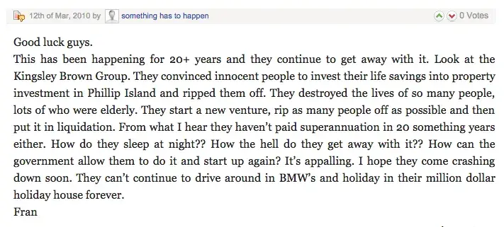 Hello I'm a resident of Port Douglas & acquainted with Robert Kingsley Brown. I have recently been directed to the complaints board site