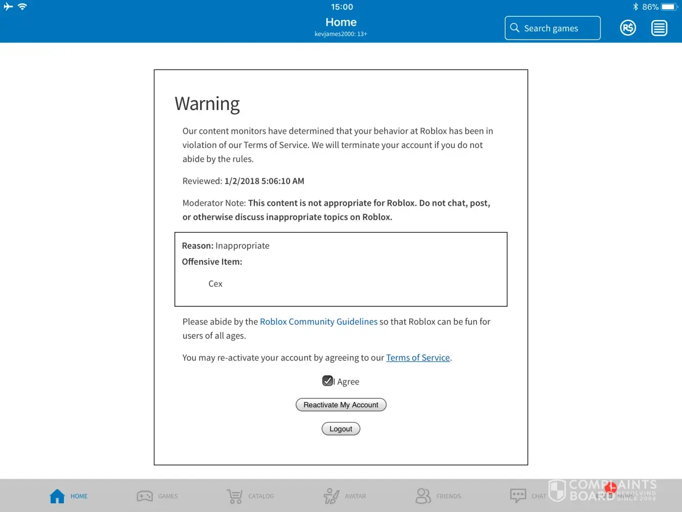 On the 2nd of January I received an email stating that my account would have to be reactivited and that it would be suspended if I did not follow the rules. My son who is 9 and autistic was very upset to find he could not play ROBLOX and then he found out why which left him very confused. It was very tricky for me to explain. According to your email a supposedly in appropriate word had been used. My son was on the chat and the other people on the chat system were talking about were to buy games. My son replied and had used the Name Cex. I say name as he is correct as in the UK there are a very popular brand of trade in stores that deals with console games and dvds and is called CEX.