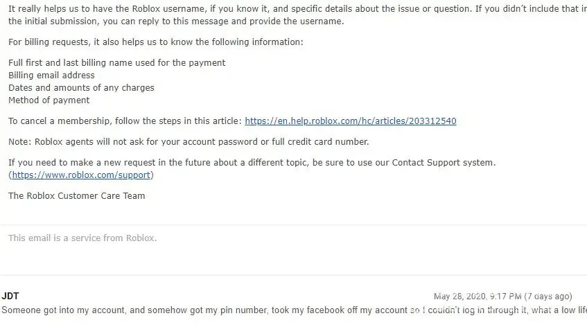 I was locked out of my account by a hacker, I know it was a hacker because he also had my pin number to sign in. I contacted roblox about the situation, and they told me that the wait would be longer than usual. So I waited for a bout a couple of days, no response, waited a couple of more days, no response. The sixth day, no response, then the seventh day...