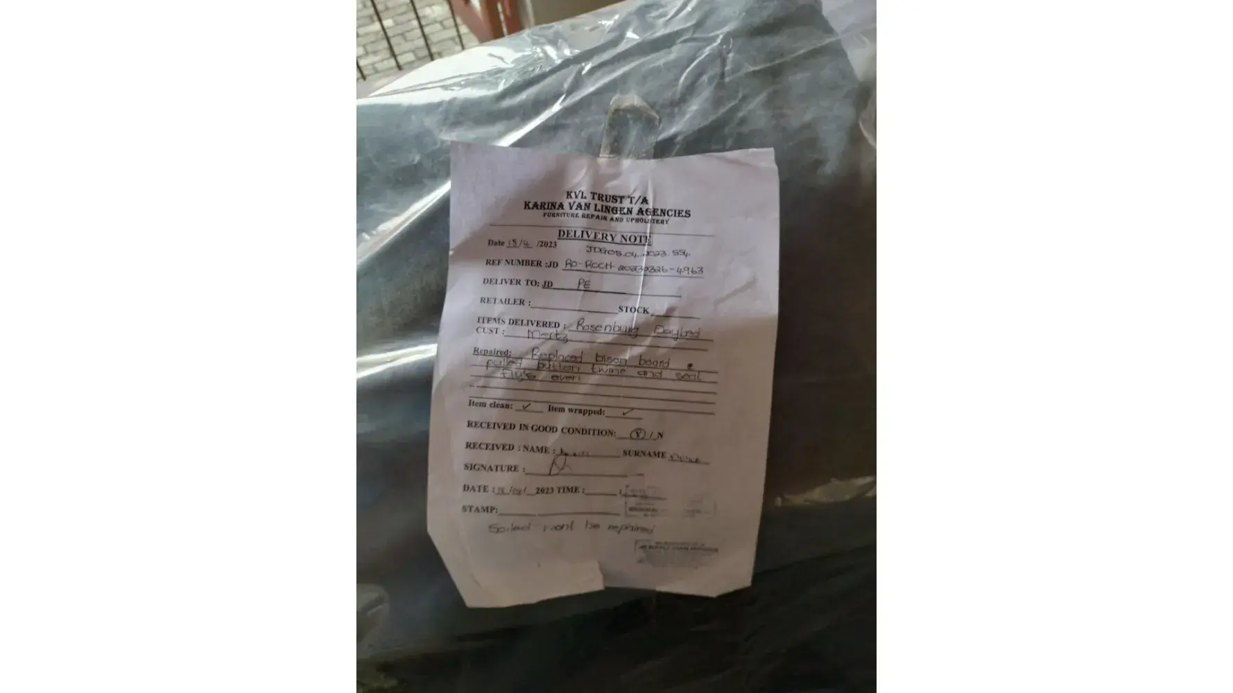 The Lounge suite was only delivered on the 9th February 2023. Attached please find the photo’s of what the lounge suite looked like when it was delivered. We took it up again with Celeste the branch manager where she arranged for it to be picked up again for repair. They picked it up on the 13th April 2023 and delivered it again on the 27th April 2023 with a note on it that reads â€SEALED WON’T BE REPAIRED†please see note attached.