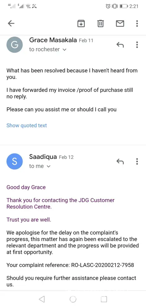 I bought couches on account from Rochester, my 3 seater recliner couch broke during lockdown. I reported it, they came and fetched it in October. It is the 23rd of February and I still do not have my couches. I have phoned numerous times, they sometimes say they will arrange for the pick up of my couches and then are surprised to hear that they have already picked up my couches and I am waiting for delivery. I was promised delivery on the 6th of February, they said the driver will phone me about an hour before delivery. Nobody phoned me on the 6th of February. I have complained online, I have complained on their Facebook page and still nothing, all I get are promises that "someone" will be in touch with me shortly. I have phoned again today (23 Feb 2021) and was promised delivery on the 27th of Feb, again told the driver would phone me an hour before delivery. When I asked for some kind of guarantee that this would indeed happen, I was told they can't give me one. When asking to speak to a manager, said manager responded saying he cannot take my call as he has other things to do and I should just send him an e-mail. His name is Sameer Fakir. Still no couches, still no guarantee that my couches will in fact be delivered as promised.
