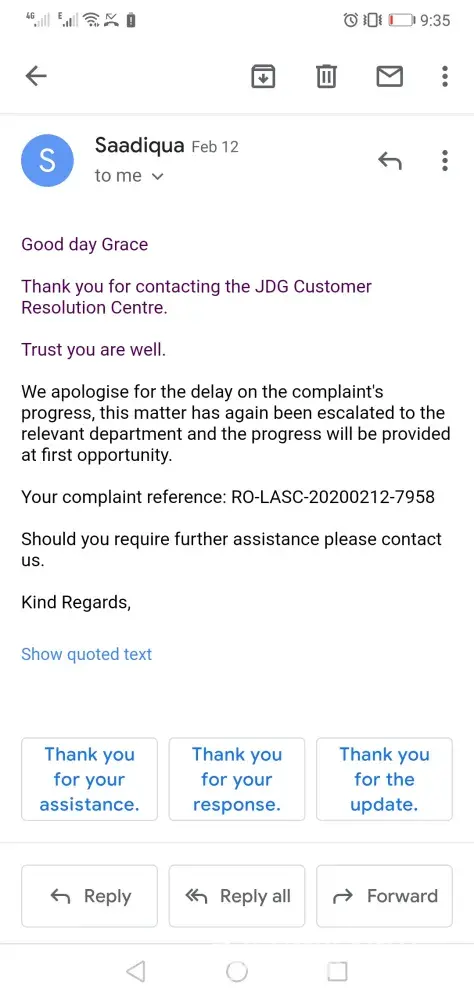 Lidia calls us at 8am this morning we at church to say she is Sorry (mind you your employees always understand (maybe another language certainly not English) or they are sorrr), but they will deliver at 11:30am, we rush home and now I get delivery at 13:15pm and guess what THE LOUNGE SUITE IS NOT MASTERGUARDED, but once again they will do it on my laminated flooring which they messed up the last time.