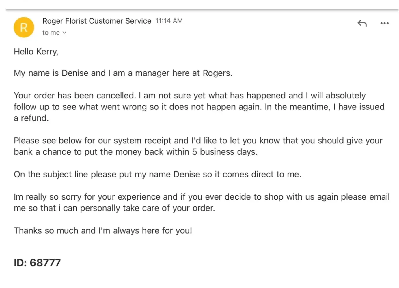 I was furious to say the least. I called them back and tried to explain so they put me on hold with music, then someone else came on and put me on hold with music and after enough of it I hung up. I sent a message to [protected]@Rogerflorist.com and Denise replied and said that she noticed on system that a refund is pending. I disputed with my credit card company but will see if refund is issued soon..2-5 day. According to many previous reviews, looks like I would be very lucky if I do! Shame on them for doing this to us people. I was so excited to send my granddaughter a special arrangement and they blew it! I will report them! People work hard for their money and these people are scamming us.