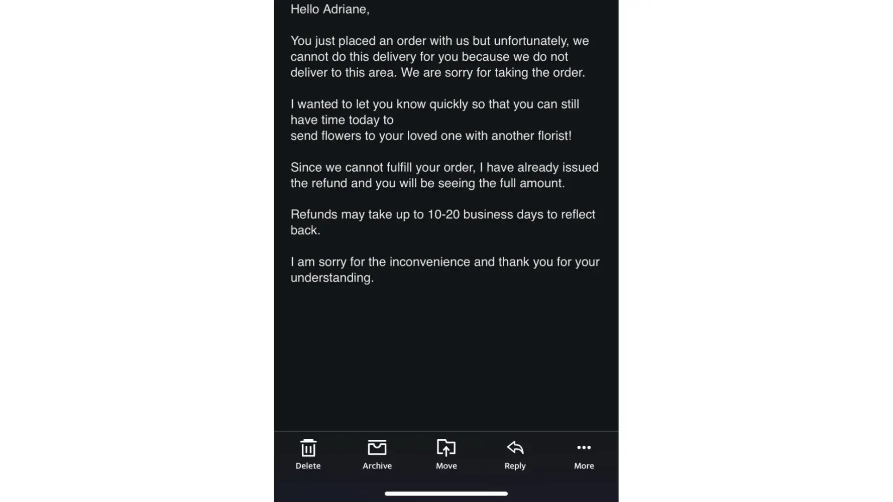 Same thing just happened to me. I ordered flowers on 19 September 22, got same email. Here it is 26 October 22 and I am still out my $70. BEWARE veterans and sr citizens (I am both), you will be ripped off.
