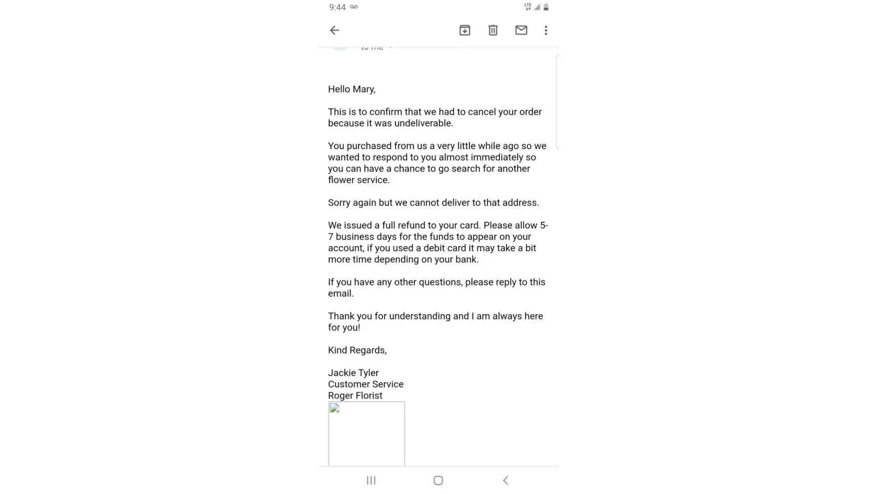 I placed an order on October 27th 2022 they took my order and withdrew funds within 2 minutes. 7 hours later they sent me an email saying that the order couldn't be filled. 19 days later I still haven't received my refund and now they no longer reply to my emails and I can't get anyone to answer the phone. I seriously doubt that this is a legit florist. Take my advice and do not give them any business.