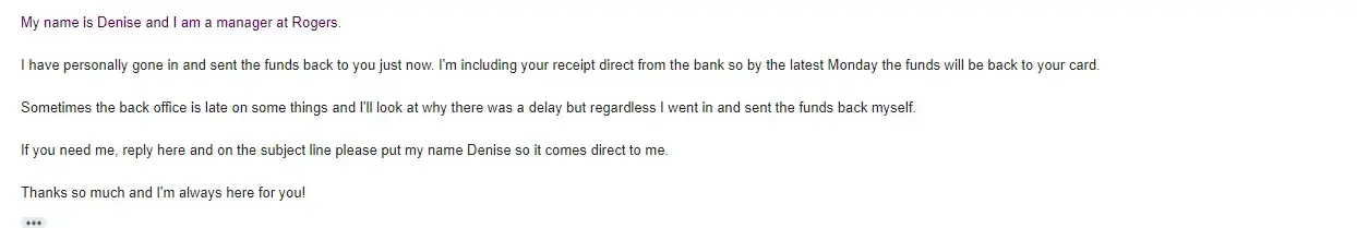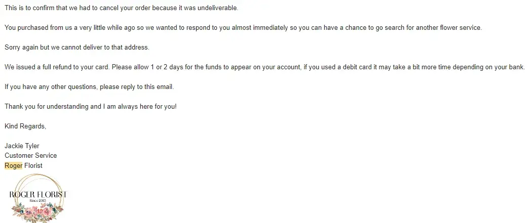 I ordered flowers from them on Christmas Eve and I spent around 80 dollar's for same day delivery to my boyfriend's mother. I sent out the order at around 10am, and around 2:30pm I received an email confirmation saying that they were no longer able to deliver these flowers due to them not being in the area and a complete refund as been sent back to my issued bank and that I needed to wait 2-5 day's for the 'refund' to completely process. Those few day's I spent waiting for the money to get refunded never showed in my account, still messaged their 'support' and it got me absolutely no where with a woman named "Denise" and to have the email's be directed to her by in the "RE: Denise " which she responded IMMEDIATELY. Which is really uncommon...? There's absolutely no reason why this person responded to me "Are you sure it's not back under Roger's Florist?" in another stated email, or that "I took it into my own hands to handle it... and i'll get to the bottom of it!" is what typical scammers use to give the hope that you'll get ur money returned which this is not the case. They will not return your money, and keep responding to emails giving you false hope or that they'll just overall stop responding to you. Hoping this help's someone else considering it ruined my christmas gift for someone special.