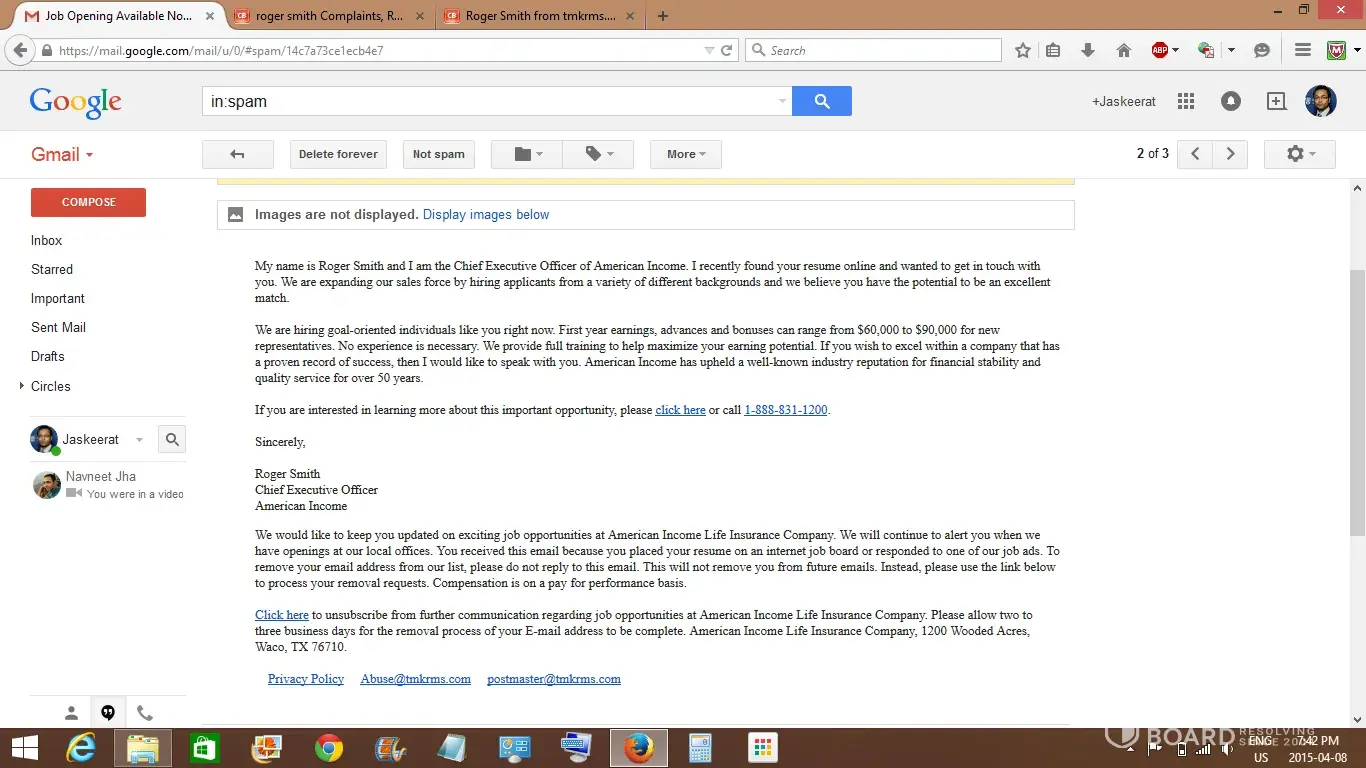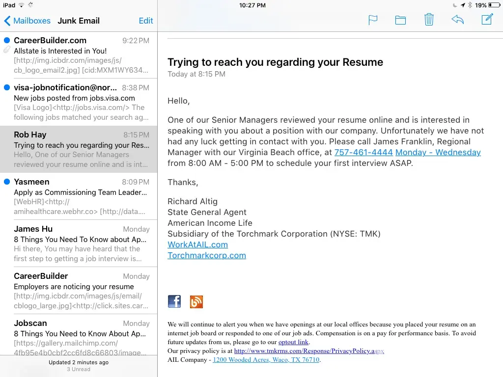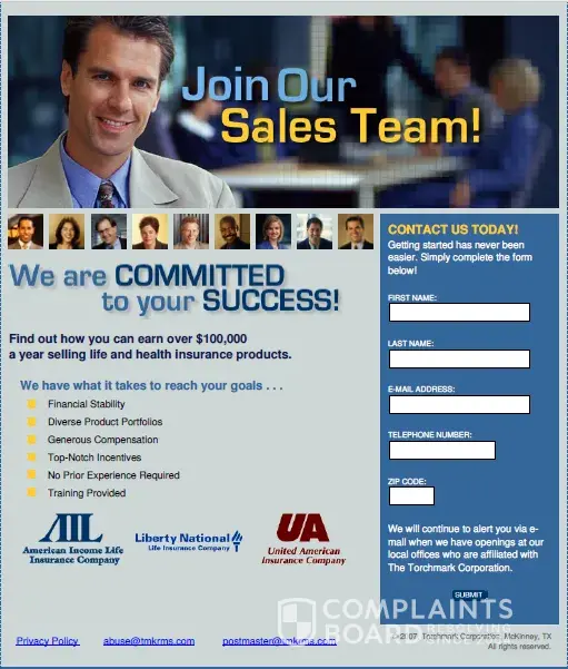 I agree that they are coming from candidate job searches from Indeed or Monster because the email address they arrived at is the one I use for them. Careerbuilders forces you to use a different email address every time you cancel and then sign-up again and that is a different email address than the ones I got. Careerbuilders sells your info to 3rd parties and that's how I know when it's from Careerbuilders because the email arrives at a different address. I've received some emails where I have to create an account just to unsubscribe. Between the lack of employment search results and this 3rd party crap, I will never use Careerbuilders again. Too bad because they were once a good site many years ago but have gone downhill in a really bad way at least for my job searches. I received 7 of these emails with the domain of tmkrms.com in one day. From my previous exposure to Direct Marketing, this then smelled of a system that people just bought into not some Nigerian scam as they traditionally are attempting to get money out of you. From the quick research I've done so far it's appearing to be more of an affiliate company that has recently done some kind of ad campaign. The biggest identifier of this is all of them have the same domain even though they are promoting different companies. After I did a little bit of digging around I found that tmkrms is associated with Torchmark Corporations which came from the WHOIS information. I know the site tmkrms.com is an affiliate site because when the tab is my browser shows "Join Our Sales" and when I hover my mouse over it, then it shows "Join Our Sales Team - Torchmark Affiliate Companies". This is also in the browser header code which you can see by doing "Ctrl+U". Further down in my search results is a link to torchmarkcareers.silkroad.com which show the Torchmark Corporation logo with social media links. I took a look at their LinkedIn profile. This URL for torchmarkcareers is a subdomain so I looked into who silkroad.com com is. Wikipedia says, "SilkRoad, Inc. is an American multinational human capital management software company. SilkRoad provides cloud-based HR software solutions that enable customers to find, attract, develop, and retain talent." So that just indicates that they are using this site for career development. Within these same search results for "tmkrms.com" is a link to torchmarkcorp.com. At this site you quickly see that Torchmark Corporation is a publicly traded company with the stock ticker of TMK. I discovered all of this in less than 30 mins of investigation so the original complaint being a Nigerian scam is just a shoot from the hip response that didn't look into this at all. Part of the online job search deals with legitimate insurance and financial investment opportunities. I used to get them from AFLAC and now they're coming from Farmers and American Family Insurance and a couple of others that are not so well known. The problem I have with these emails and the affiliate website is that is looks like a scam site and that's because of all the years of these type of affiliate sites that did scam to some degree. I've been interested in Direct Marketing for a long time and have taken part in some of these things where the seller of the system gets rich of of the opportunity given. It's not that the opportunity isn't viable but you make more money selling the idea than the process itself. From my quickie research I can now say that these are legitimate people just looking for a way to earn self-employed independent income in what has become known as the Gig Economy yet the marketing for a publicly traded company as large as Torchmark Corporation is deplorable and hurts these affiliates seeking income generating opportunities due to this. One of the companies that approached me that I had never heard of had a website informative enough for me to understand what it was about. I'm not personally interested in these types of things yet if Torchmark Corporation has any concern for its affiliates then they need to create a much better looking AND informative version of tmkrms.com so that those who may be seeking this type of work won't be put off. It sure would help the recruitment process for sure.