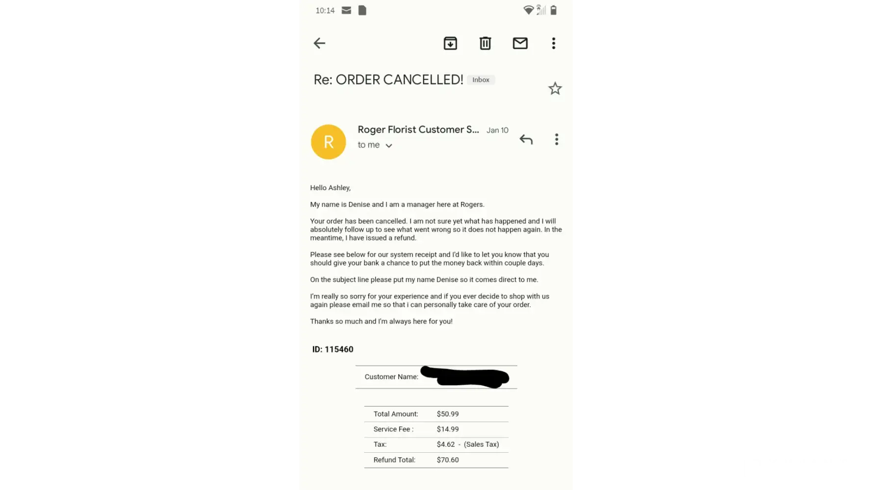 I ordered flowers from you to be selected to my mother at Fairview hospital. You responded with a response that I now know you give every one! I want my 111.00 back NOW!