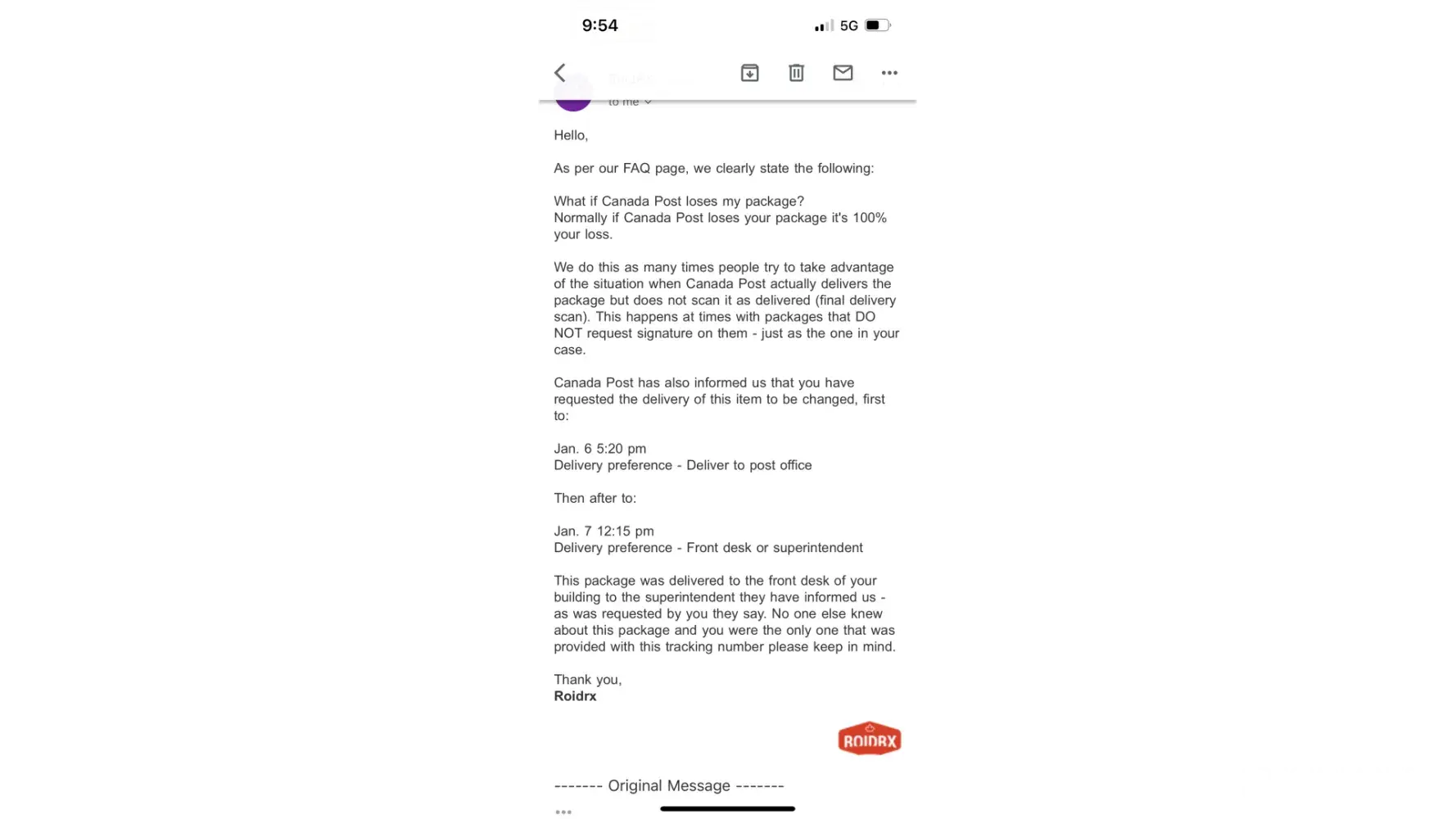 I’m working on getting confirmation from Canada post that the conversation Roidrx says they had with them, never happened.