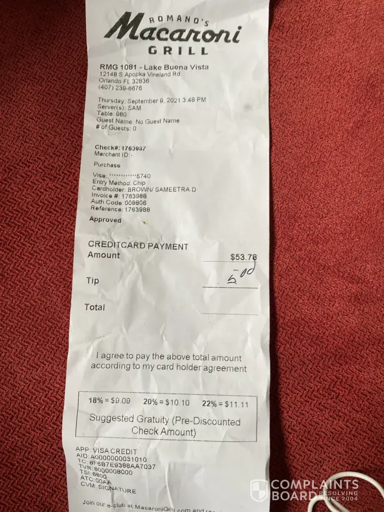 👉  Submit a complaint about Romano's Macaroni Grill