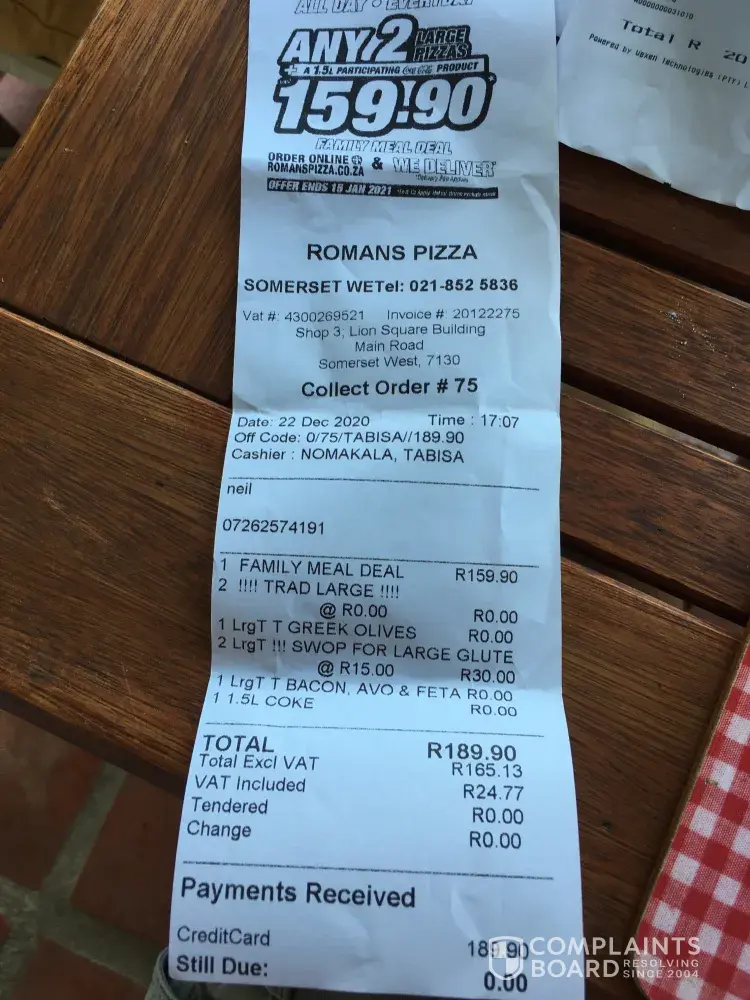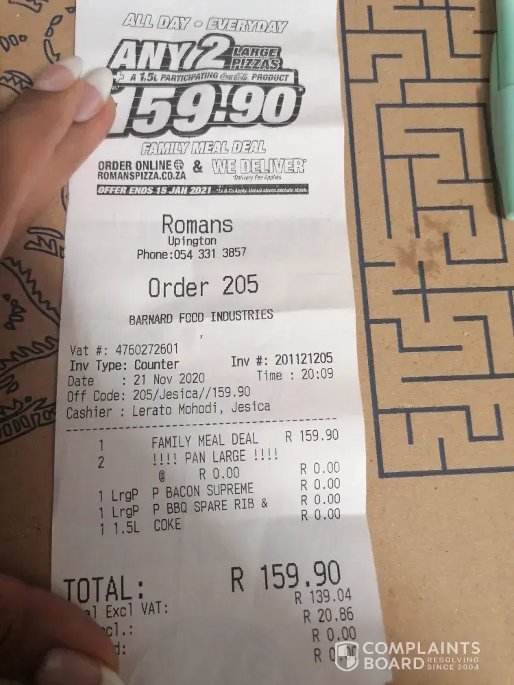 We were at romans in vanderbijlpark yesterday the 22/12/2020 at 18h14 to buy that special 2 large pizza and a 1.5liter coke for r159.90 we took seafood and bbq spareribs and mushrooms and when we got home we were busy eating to find out the calamari on the pizza is raw now me and my hubby are sick of that this morning. We even waited till 19h15 for the pizza.