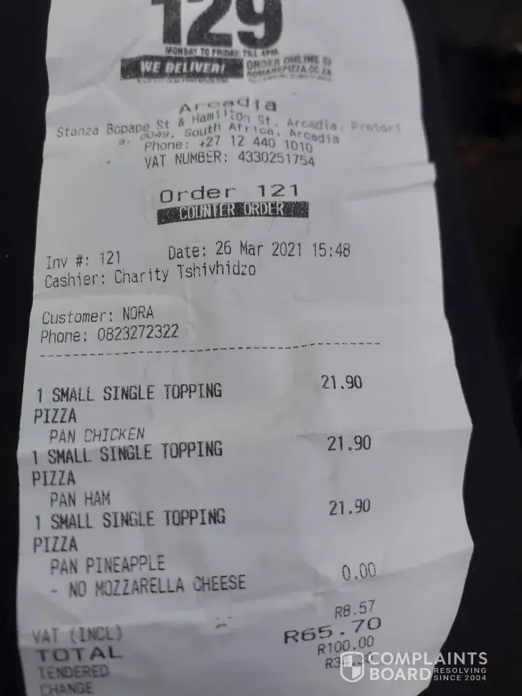 Please can I lay a complain about Roman's Pizza at Meiniger Road, Nelson Mandela Drive, Shop 2 Shoprite Centre, Modimolle, 0510, South Africa