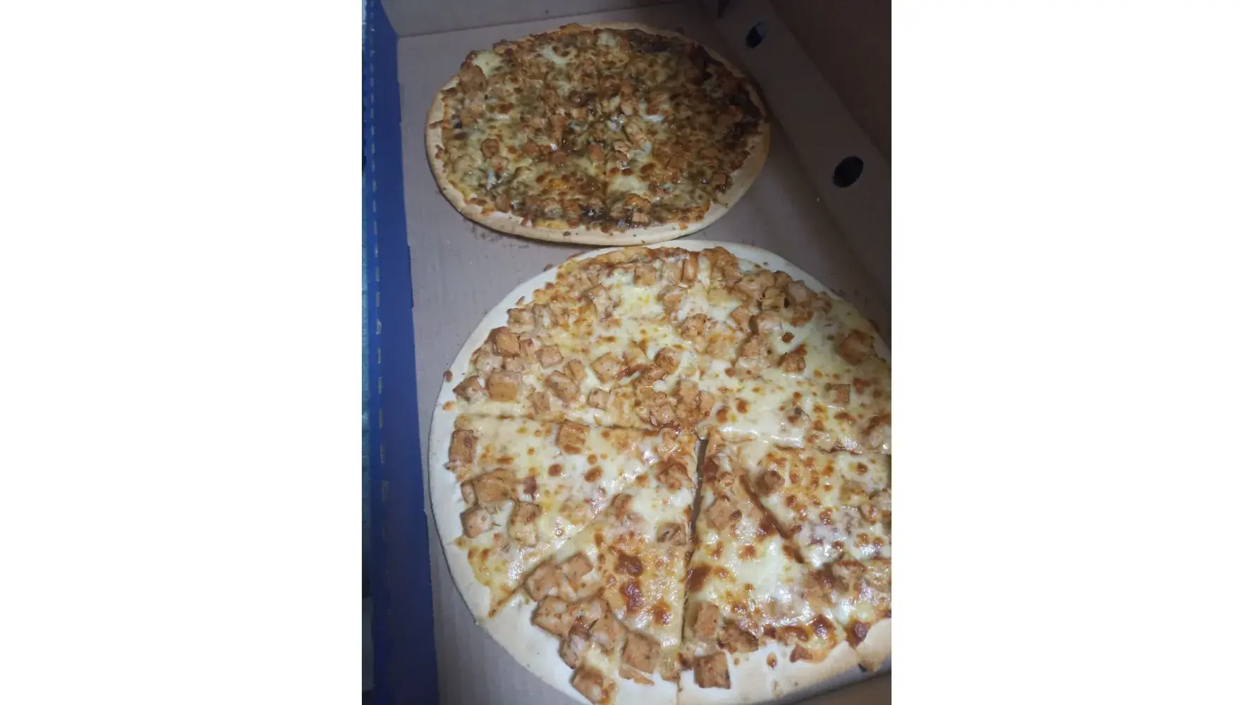 So the delivery guy brought our food we are very disappointed the pizza was burned the base was really hard and the lasagne was burned aswell the sides of the Lasagne was black from the burn.