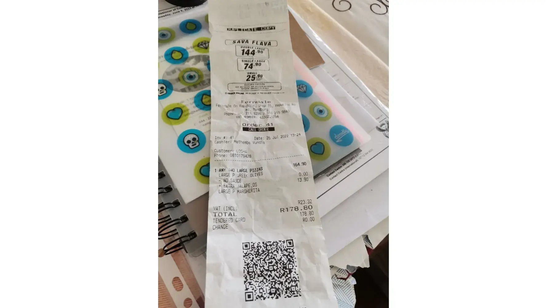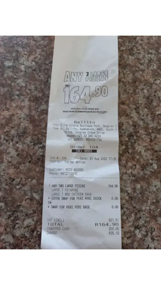 Good day my name is Nic vd Merwe, on the day of 1 Sept 2022 at about 18h00 we have ordered 3 x large pizzas online with order number 207 at Mayville Romans Pta. After an hour i phoned the shop to confirm why is our order late, respons they are busy? 19h10 i phoned again still same reply we are busy and the driver left 15 min back, we are staying in Daspoort not so far from mayville. 19h15 the driver stopped at our house with our delivery cold and i asked the driver why is our pizzas cold and he replied it cant be he just came from the shop. Very poor service
