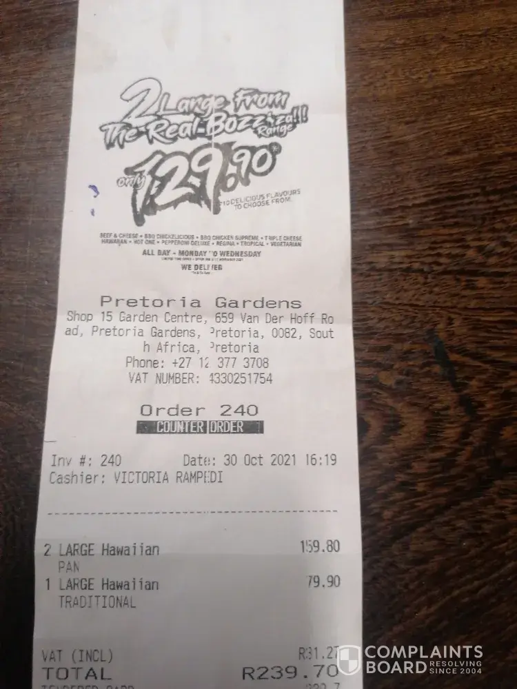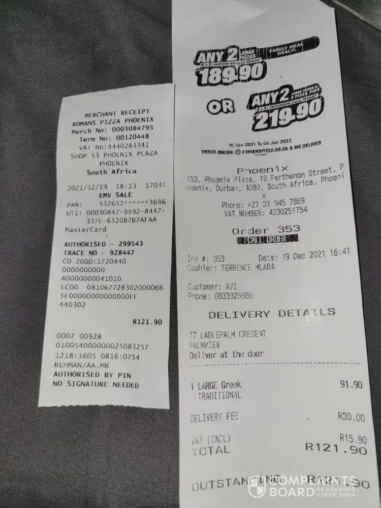 On Saturday, the 30th October 2021, at 16H19, my wife placed an order for 3 large pizzas, at Romanz pizza, shop 15 Garden Centre, 659 Van Der Hoff road, Pretoria Gardens, 0082, South Africa.