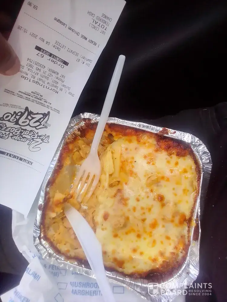 I bought the pizza on special 27/11/2021 I phoned to place my order around 16:30 Bongeka Mlilwana [protected] it was sweet Chili Chicken and BBQ sparerib and mushrooms I am not happy with the sweet Chili chicken the Dow is not well cooked as I am writing my email the time is 04:06 I have stomach cramps sitting in the bathroom my husband and my 9yrs old daughter as well my husband ate 2 slices my daughter 1 and I ate 1 I still have it as evidence I am so disappointed this is my first time getting this and I always buy my pizza in the same place ☹