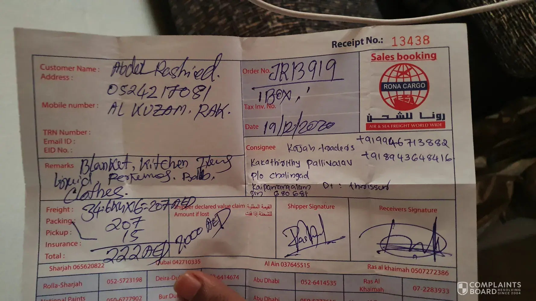 I was relocating to India from Sharjah, United Arab Emirates in September 2007. I sent a few electronic items( 2 TVs & a home theatre system) by sea cargo through Rona Cargo in Sharjah to Cochin, Kerala, India. The consignment was supposed to be delivered at my home within 3-4 weeks, but the actual delivery took place after nearly 2 months. It seems Rona Cargo has another local agent in Kerala who does the clearing at customs and other documentation work. When the consignment was finally delivered, there were two cartons.. one a normal cardboard box and another one a wooden crate. The delivery was done late in the evening (at around 7.30.p.m) and the delivery boys quickly left after taking my mother's signature on the delivery note. Later when we opened the wooden crate, we noticed the home theater system missing. We immediately reported this to both Rona Cargo and the local agent. The local agent asked us to weigh the items and see if the total was around 84 kg. After weighing the items, we found it was only 62 kg, quite evident that 22 kg went missing. There were other confusions regarding the consignment number.