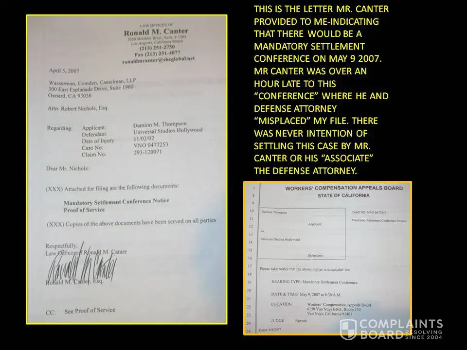 I am posting this complaint against RONALD M.CANTER a Worker's Comp attorney practicing in Los Angeles. My case is current since July 2003 when I met and attained Mr. Canter after I was forced off the job by my maniacal employer under fraudulent reasons. I was referred to Mr. Canter through Prepaid Legal. Little did I know this attorney would go on to do his best to sabotage my case by his actions and his non-actions.