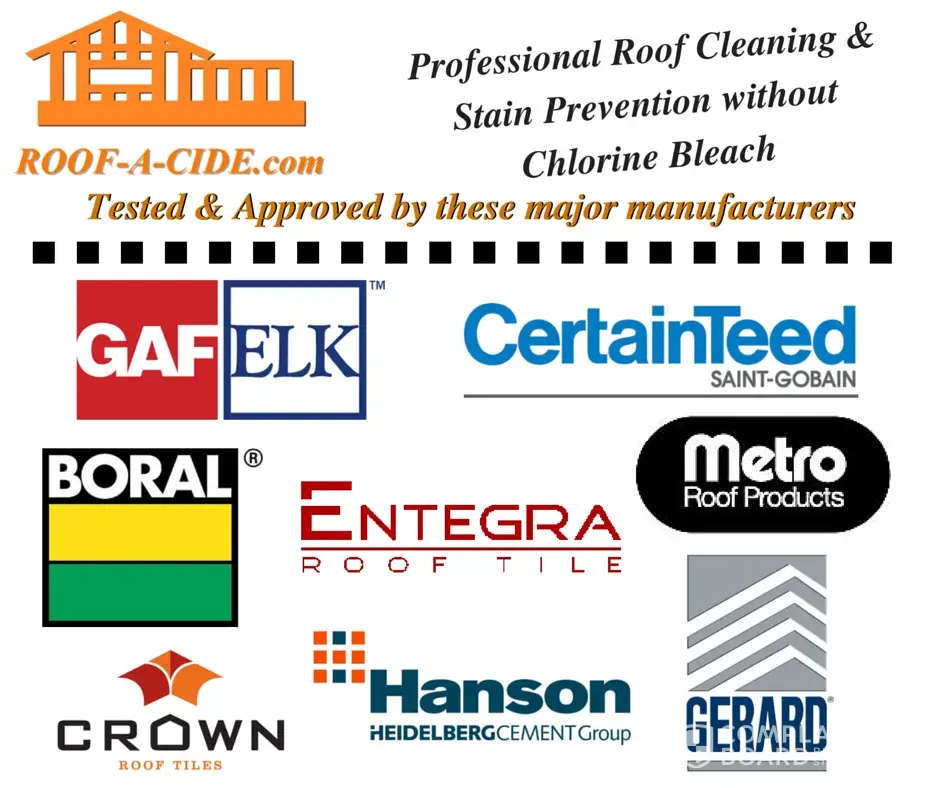 Roof-A-Cide® is the ONLY EPA Approved solution that safely PREVENTS roof stains for years with each spray. It is also approved by the largest roof materials manufacturers of Asphalt shingles, Clay Tiles, Concrete Tiles, Stone-Coated Steel, and Slate.