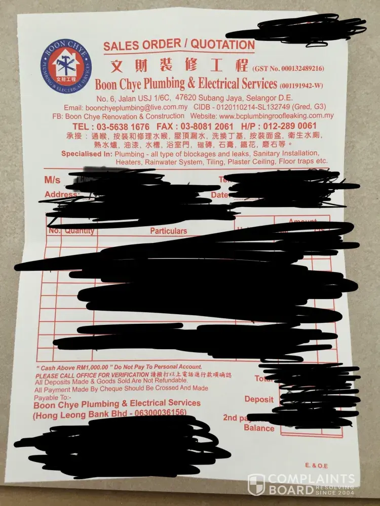 Read full complaintBoon Chye Plumbing and Electrical Services - roofing