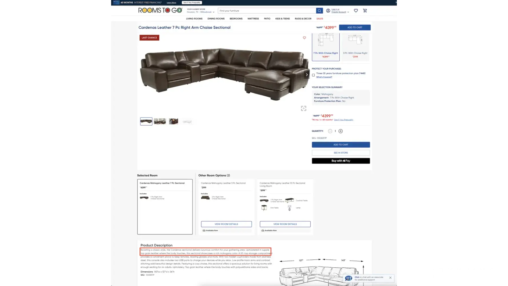 This has not been resolved. I am STILL waiting for ROOMS2GO to reply.