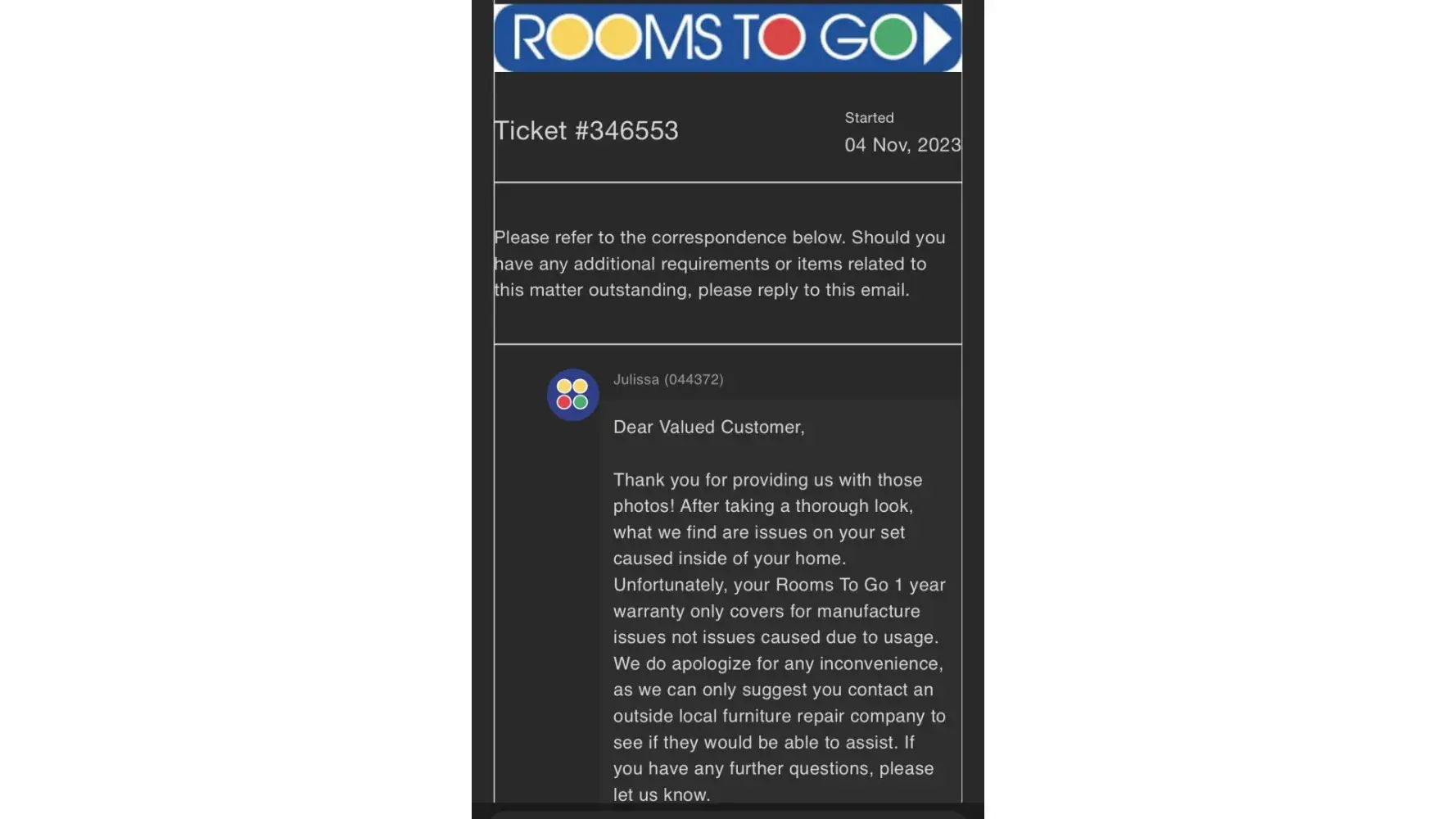 Rooms To Go Warranty response
